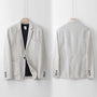 Crafted from a lightweight linen blend, this set features a single-breasted jacket with notch lapels and patch pockets. The straight-leg trousers offer a relaxed fit with an elastic waistband and button closure.